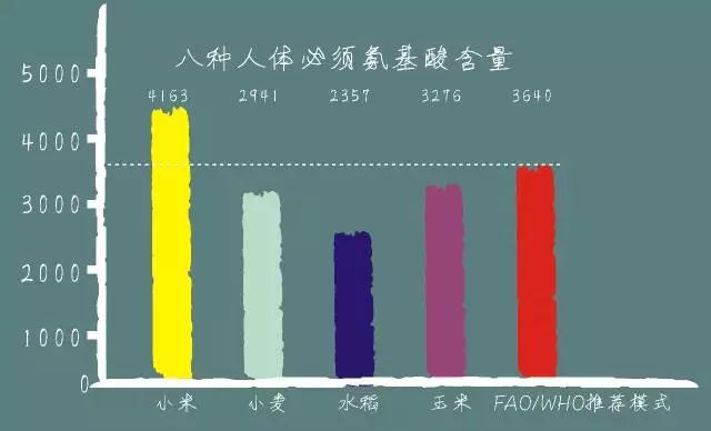 小米的氨基酸種類(lèi)齊全,含有人體必需的八種氨基酸。除賴(lài)氨酸偏低外,其余均符合聯(lián)合國(guó)糧農(nóng)組織(FAO)和世界衛(wèi)生組織(WHO)所推薦的模式。